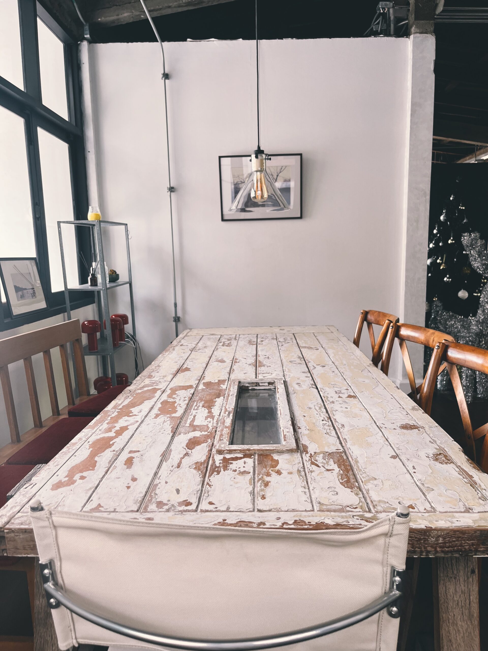 這張桌子是老門板改裝而成。中間凹陷的玻璃區域,店家之前放上了幾個玻璃瓶,瓶裡插著可愛的小花,一開始放在樓下的採光區。