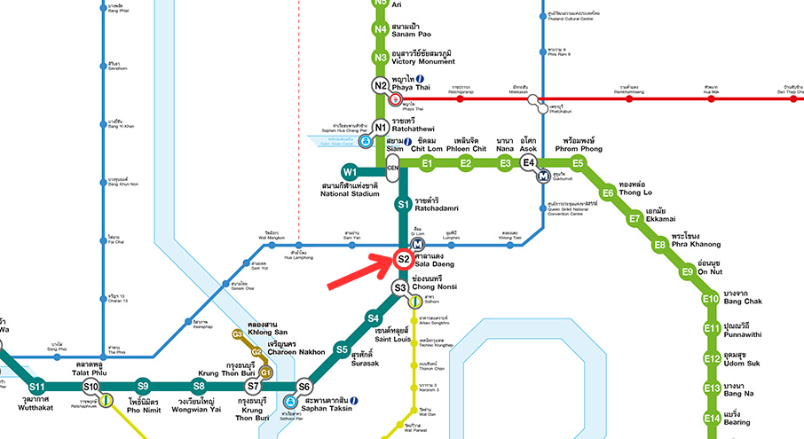 若是搭乘捷運前往,我們比較常用的方式是搭到BTS Sala Daeng站,出站步行約11分鐘。BTS Sala Daeng站是位在空鐵的深綠色Silom線上。若從市中心的鬧區過來,從最熱鬧的大站Siam站(淺綠色蘇坤蔚線Sukhumvit Line)轉乘兩站就抵達。